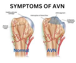 AVN occurs when blood flow to a bone reduces or stops completely. Without oxygen and nutrients, bone tissue begins to die. Gradually, the affected bone weakens and collapses. Most commonly, AVN affects weight-bearing joints such as the hip. However, the knee, shoulder, and ankle may also be involved.